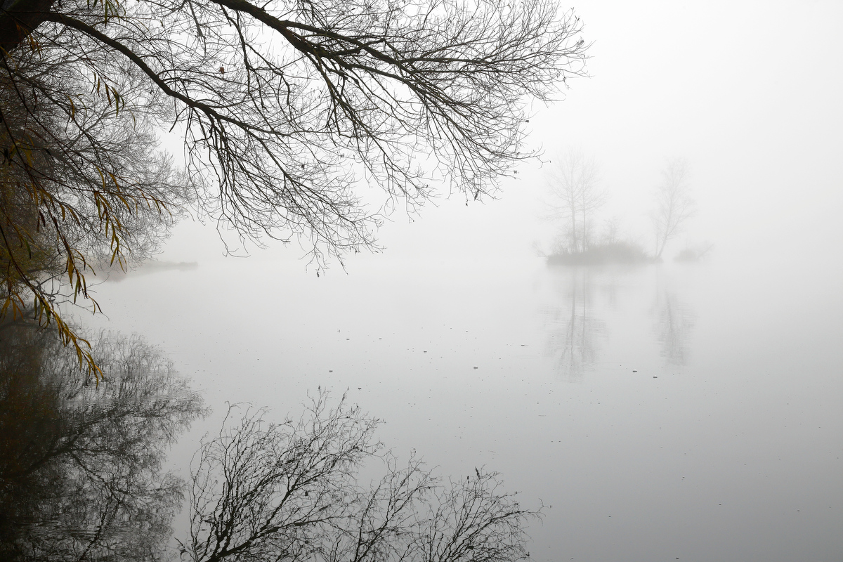 Belichtungszeit 1/10 ISO-Empf. 50 Objektiv Schneider LS 80mm f/2.8 Blendenzahl 11 Brennweite 80 Morgenstimmung am Kuhsee bei Nebel, Augsburg, Schwaben, Bayern, Deutschland -